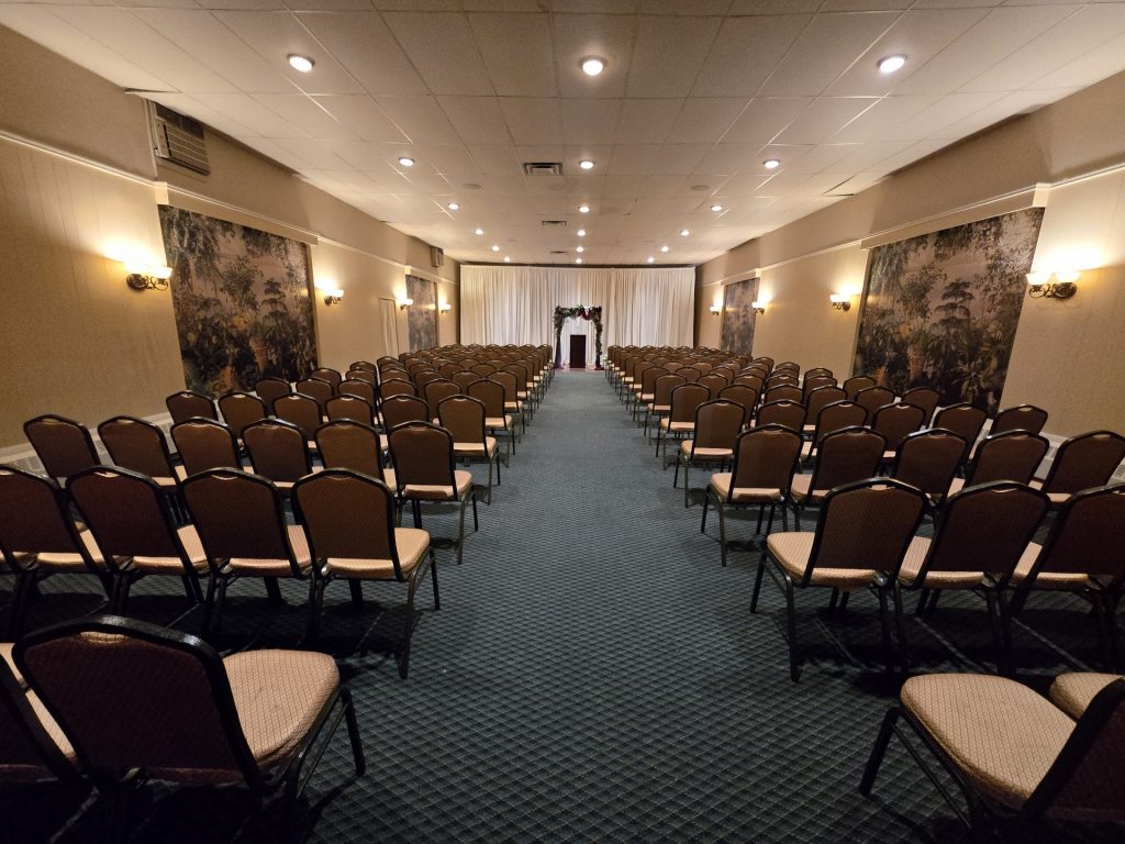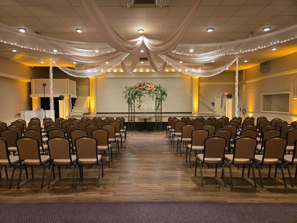 This option also takes place in the Maple Ballroom, but offers a more traditional ceremony-style layout. An aisle is created through the center of the ballroom, and guests are seated together on the dance floor for the ceremony itself. This approach gives couples the feeling of a more classic ceremony setup while still enjoying the convenience of using the same room for both ceremony and reception.